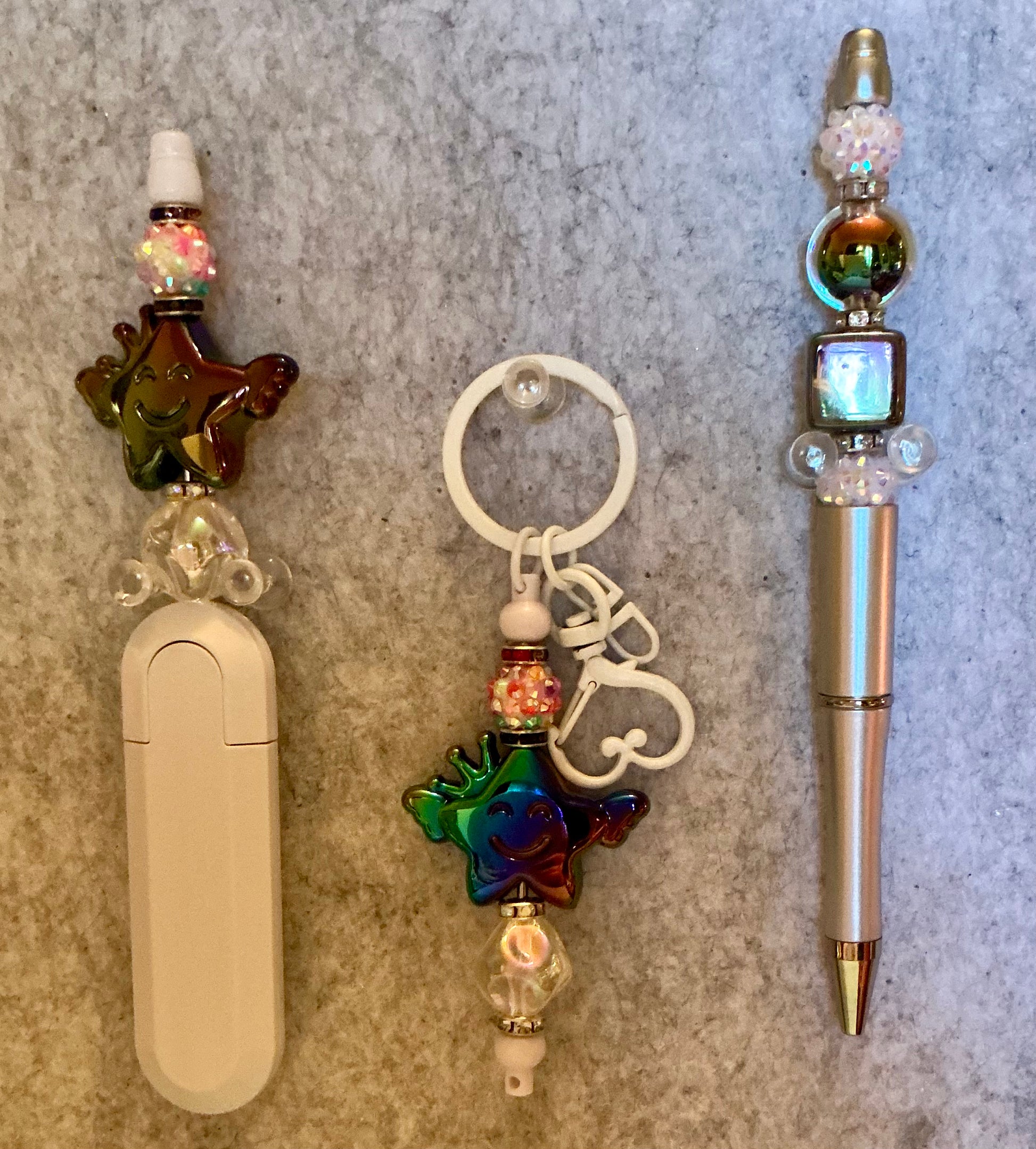 Set of pen, keychain, and box cutter.